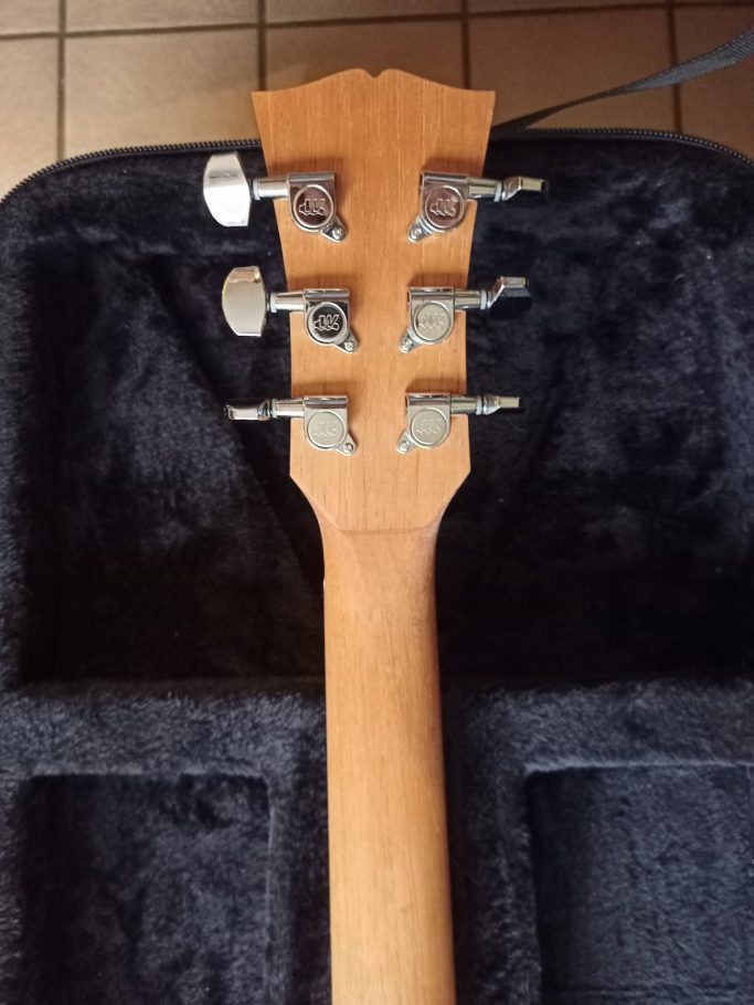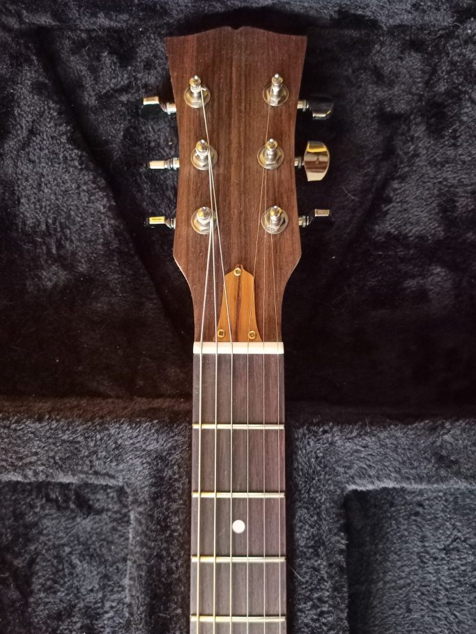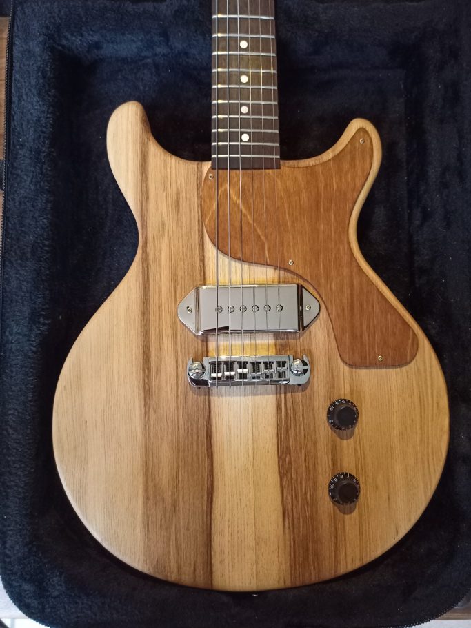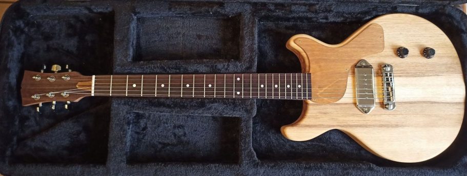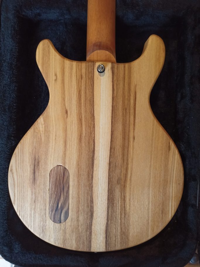 Cette guitare a été la deuxième que j'ai fabriquée au cours de ma formation à l'école de lutherie de Bédarieux. Le but était de nous montrer la programmation et l'utilisation d'une machine à commande numérique. De ce fait, nous avons usiné la forme de la tête et du corps. Évidement, cela n'enlève rien à tout le travail qu'il y a derrière (réalisation du profil du manche, assemblage du manche…) Je suis très content de cette guitare, car malgré son design très simpliste, se cache une sonorité unique recherchée par les musiciens de rock et de blues.